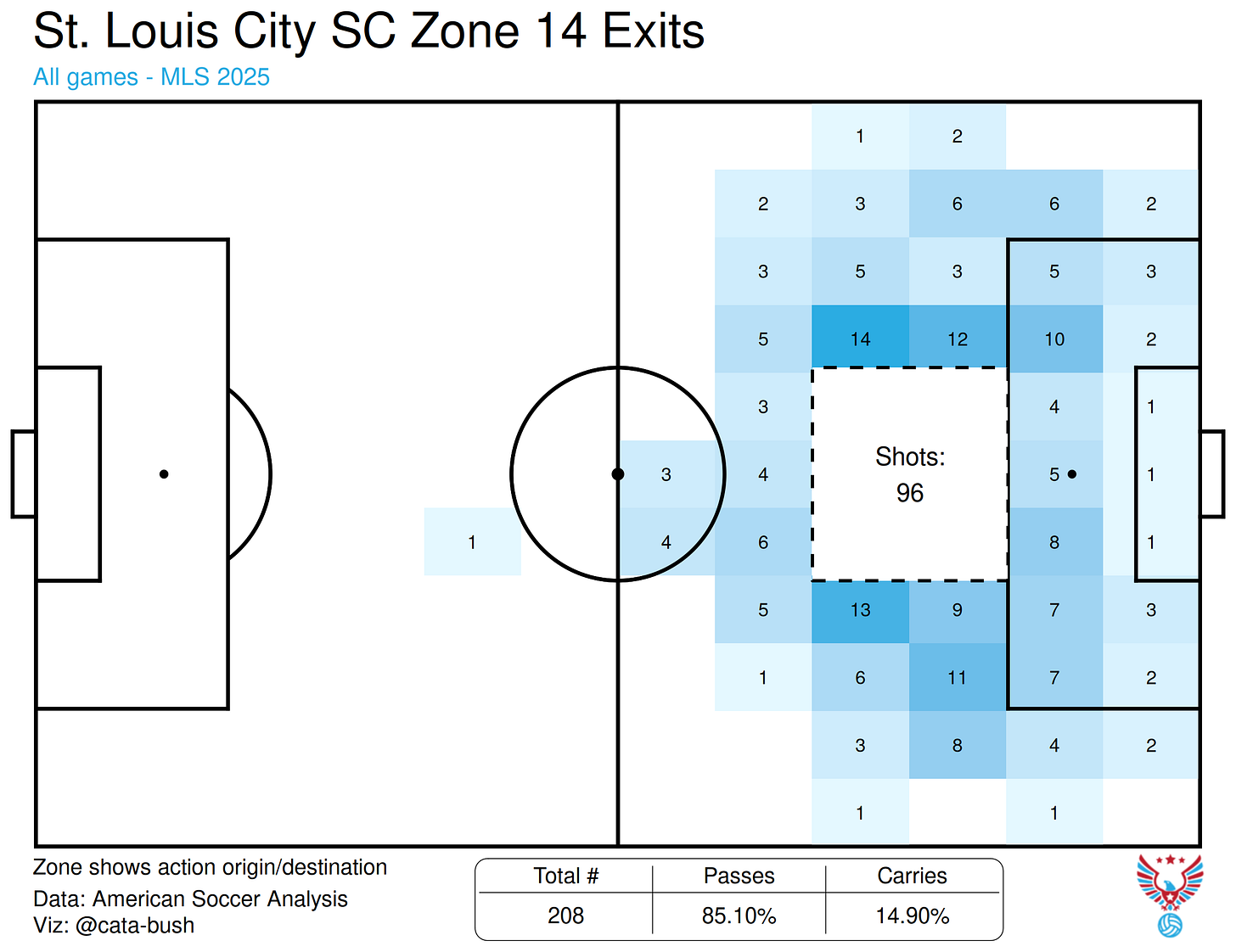 The attacking zone action plot aims to show how teams move in and out of dangerous areas. The three areas available for selection are Zone 14, the right half-space, and the left half-space. You can also select whether you’d like to see passes + carries into or out of said zone. The heatmap around the zone shows where the origins or destinations of those actions were located, respectively. The “out” option also displays the number of shots taken from the selected zone. In the table below, a breakdown of carries and passes by proportion of entries/exits is shown alongside the total number of actions.