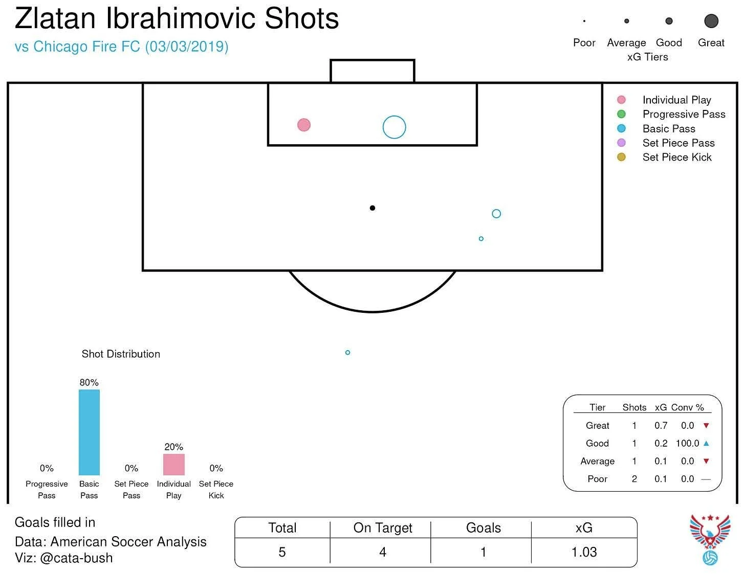 The player shot chart builds off of general shot map conventions by displaying shots as circles. Goals are filled in while all others are empty. The size of the circle is determined by the xG of the opportunity, while the color refers to the way in which that opportunity came about. The graphic relies heavily on the concepts introduced in Jamon Moore and Carlon Carpenter’s Where Goals Come From Project. For more info on xG tiers and shot patterns, you can read their original explainer here: Where Goals Come From.
