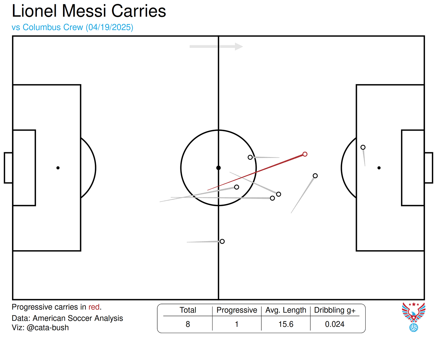 The carry chart is identical to the pass chart, but instead of displaying progression through passing, it shows how players traversed the field while on the ball. A red highlight indicates a progressive carry (using the same definition as above).