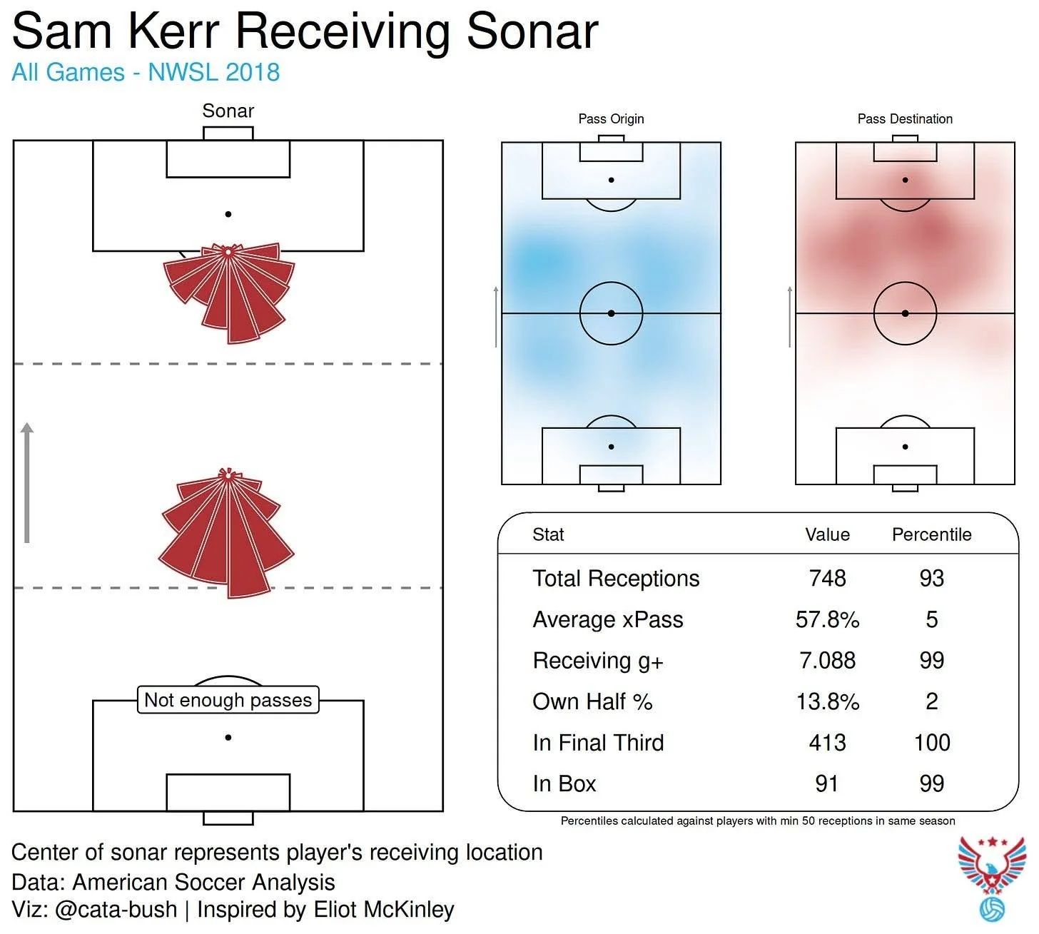 The passing sonar is based on Eliot McKinley’s work and shows how players are distributing the ball when they possess it. On the left, you’ll see three sonars (or fewer, if insufficient data is available) that pertain to the passes occurring specifically in that third of the pitch. The passer’s location in each pass is standardized to a central point, with the resulting pass angle grouped into polar bars. These are then plotted, with the outer bar indicating all attempted passes and the inner, filled bar indicating completed ones.