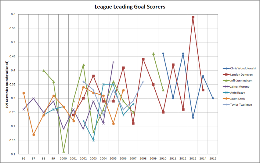With so many forward performances in MLS since 1996, this could just as easily be expected noise than evidence of a repeatable skill. With so much data, it’s simply a numbers game and a matter of time before one of them get 15 or more NPG from >45% conversion of SOT, and from there, only a matter of time till one repeats.