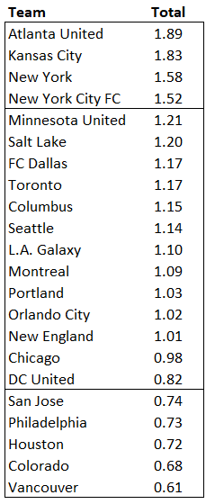 The next column calculates points per million in salary. This is honestly not a great metric but it quickly highlights that the most reactive teams do pretty well when adjusting for their salary. However, Toronto FC is problematic. Their team salary at $22 million is so high that they drag down the points per million of the middle segment. Removing TFC brings the points per million up to 4.7, still well below the proactive and reactive teams.