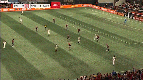 By the way, have a look at Michael Bradley pulling up at the midfield line as Almiron goes full Jetstream on the centerbacks. When people talk about whether or not Bradley has much left in his legs this is what they’re talking about. Even if Villalba doesn’t send that pass forward, I’m honestly not sure Bradley does anything to impede him.