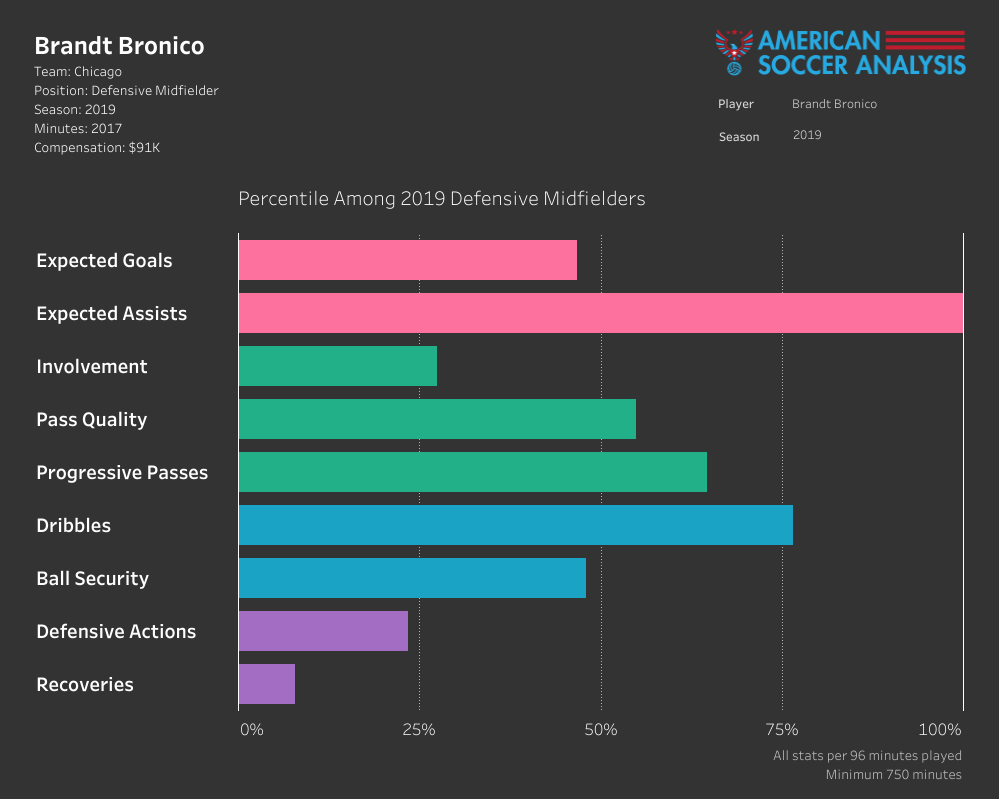 Comparing them to other MLS players at their positions, Bronico looks like a decent box-to-box player who doesn’t do nearly enough defending to be relied upon as a true #6, and Mihailovic also looks like a solid box-to-box midfielder who doesn’t create nearly enough in the attack to be a #10.