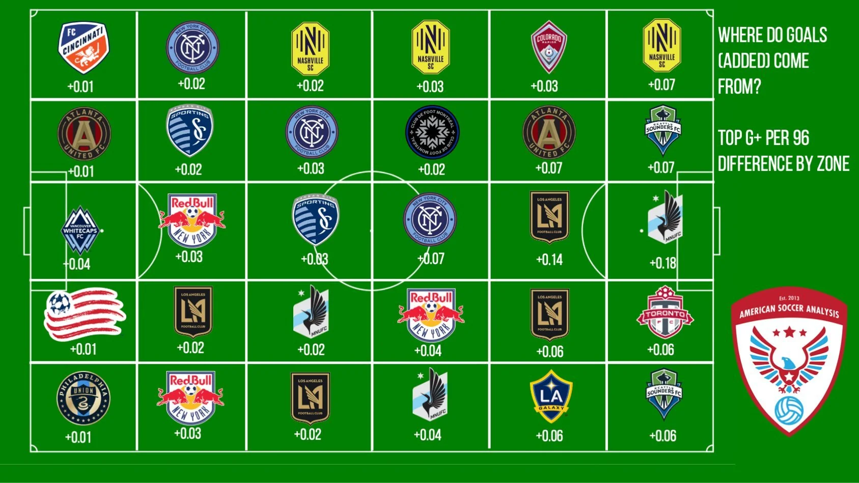 This shows the MLS team with the best g+ difference in each of the 30 zones on the field, attacking from left to right.