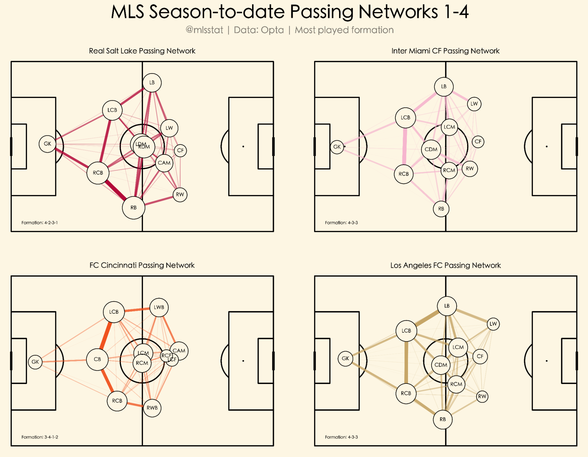 Now let’s look at passing networks for each team in MLS since the beginning of the 2024 season. Instead of looking at players’ average positions, I’ll be going by position, using that team’s most played formation and only considering passes played while that team was playing in that formation. For example, if a team played 20% of their minutes in a 4-4-2 formation and 80% of their minutes in a 4-3-3, I’ll only be looking at passes played while that team was in a 4-3-3, regardless of what player was playing what position. I’ll be looking to see what trends emerge, maybe explain why certain teams struggle, and try to break down various tactics based solely off of passing networks.