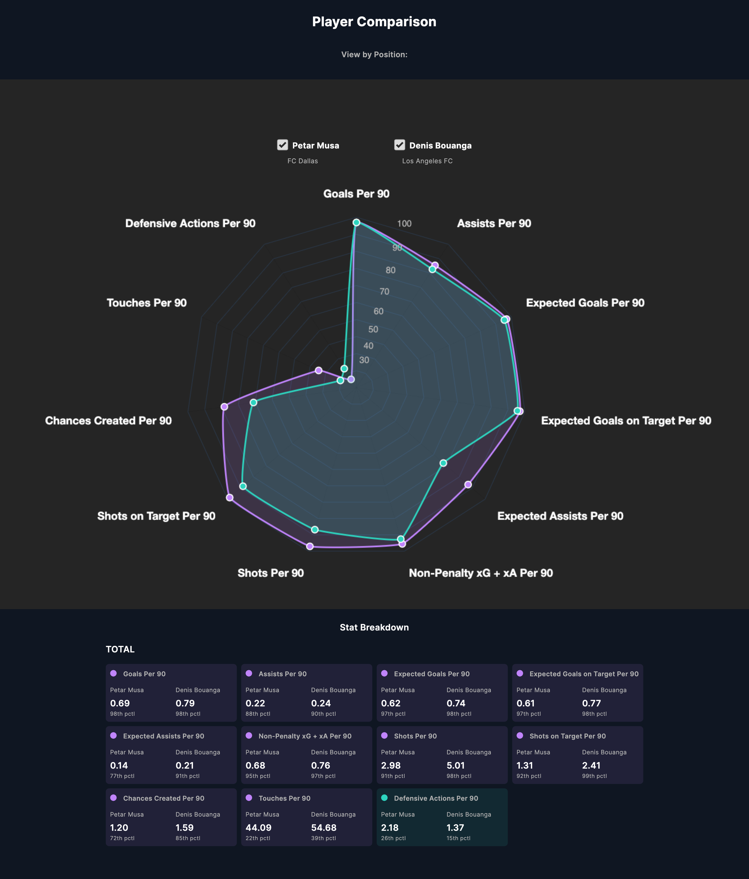 In the 2025 MLS regular season, only four players scored more than him, and two players equaled him. Taking out Lionel Messi, Anders Dreyer, and Evander from the list, you’re left with three center or wide forwards in the same echelon of goalscoring last season: Denis Bouanga and Sam Surridge with 24, and Dejan Joveljić equaling Musa’s 18. Here are the radar charts comparing Musa to those three players in relation to all MLS players; his radar chart entirely engulfs Joveljić and nearly engulfs Surridge. (Musa’s in blue in all of those.)