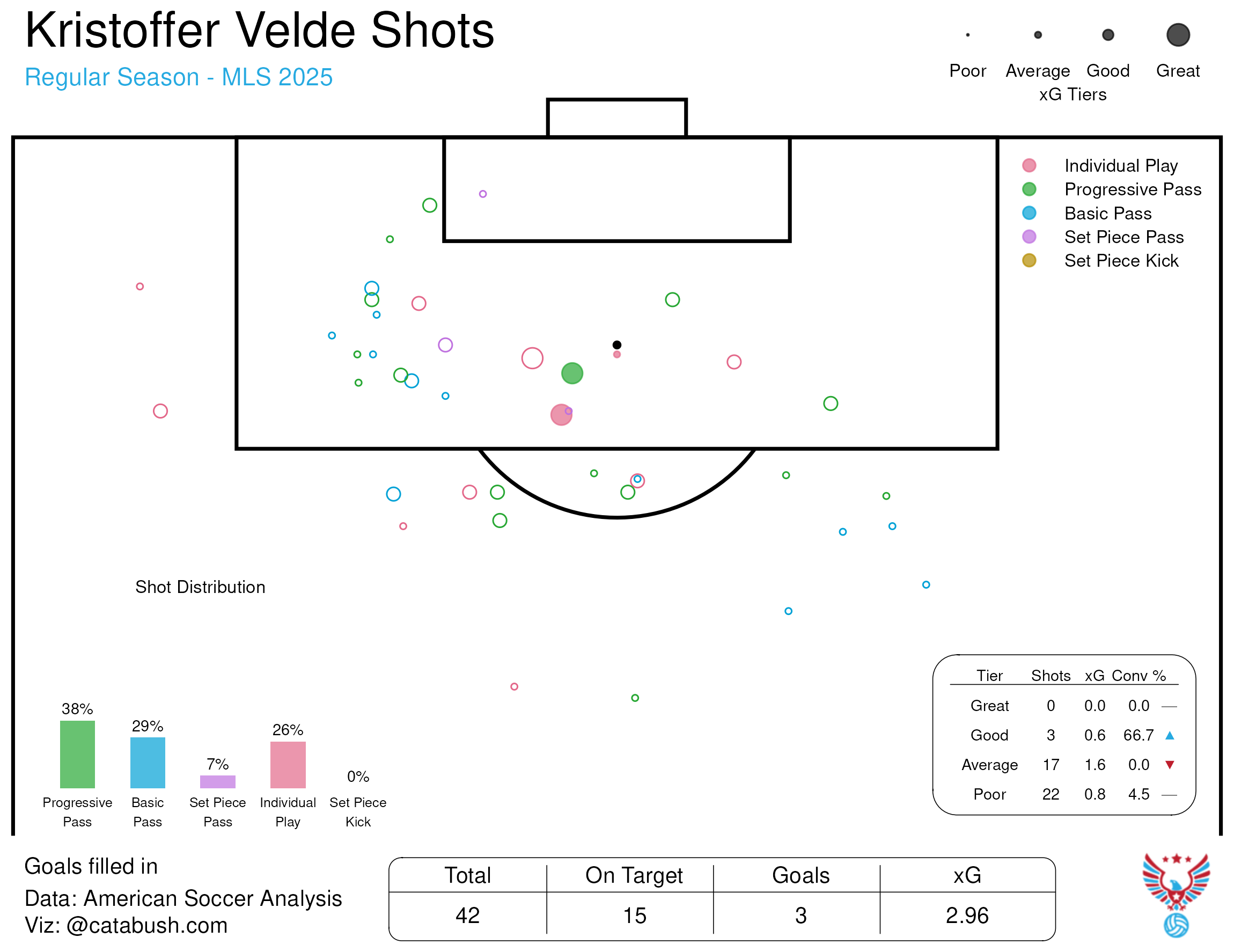 He prefers to shoot (poorly). Velde took 41 shots over 12 games for 2 goals. Most of these shots were outside the box and poor (3 xG total). In fact, of his 41 shots, only three were classified in the “good” bucket by Where Goals Come From (he scored two of them), and zero in the “great” bucket.