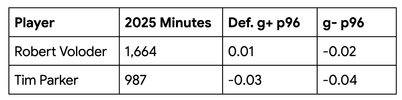 Robert Voloder arrived in the winter from Sporting KC, and put up decent underlying defensive numbers in 2025 given what a catastrophe that defense actually was. Parker did not get many minutes after years as a locked-in starter around MLS. While his defensive numbers (and overall movement) have regressed, Parker is still a talented player that is competent on the ball and has found real value from his passing since 2024. This is a workable CB pairing for Bradley’s style of play, but while fullbacks and short-term loans from the 2 team can fill the gaps temporarily, RBNY must make this reinforcement a priority before the spring window closes.