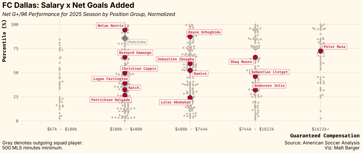 FCD’s xPoints for 2025 was a playoff-borderline 43.3, and it slightly outdid that with a 44, with an 11-12-11 record which is about as .500 as you can be in MLS. In a comparatively weak West, that was good enough for 7th place and a first-round exit to the Whitecaps.
