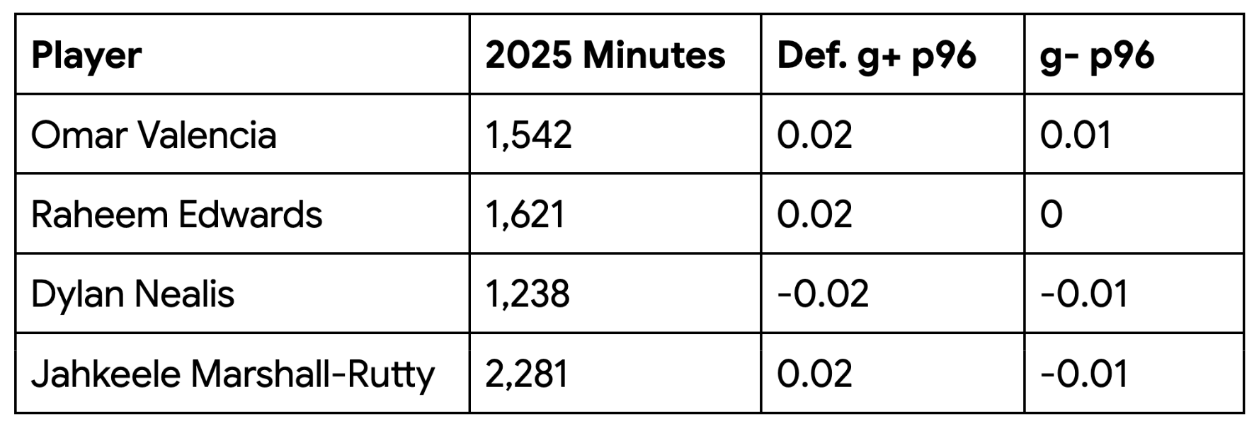 The competition for starting keeper appears to be between MLS veteran John McCarthy and former USMNT player Ethan Horvath. McCarthy has spent most of his 11 seasons as a back-up and penalty kick specialist, but he’s essentially been a starter with the LA Galaxy since 2023. In those three years he’s been (in chronological order): average (shotstopping g+ per 96 = -0.03), decent (0.1), and abysmal (-0.33, traded to New York). Horvath was once a USMNT camp regular, a Belgian league contender, and UEFA Champions League starter. But his past two years have been on the worst-finishing team in the Championship, and while bad defenses make keepers look bad, it’s hard to imagine that he will be a high-level keeper in MLS in 2026. However, he has played with Bradley and that connection could earn him trust. Keep an eye on this during the year, but one or both of them scraping together an average shotstopping year is likely the best case scenario.