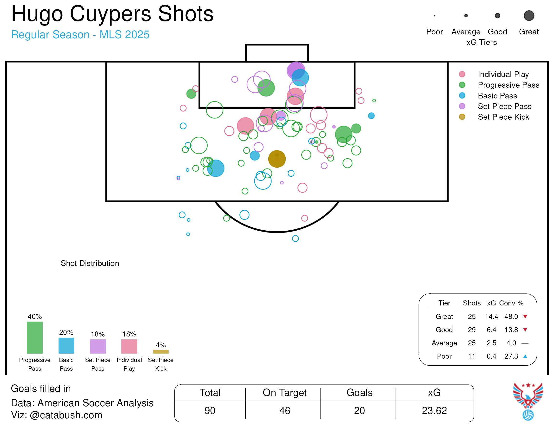 After a disappointing first season in the league, Hugo Cuypers, Chicago’s other DP, turned in a pretty great season in 2025, consistently finding space for good shots in the box. His xG jumped from 0.38 per 96 minutes in 2024 to 0.68/96 last season.