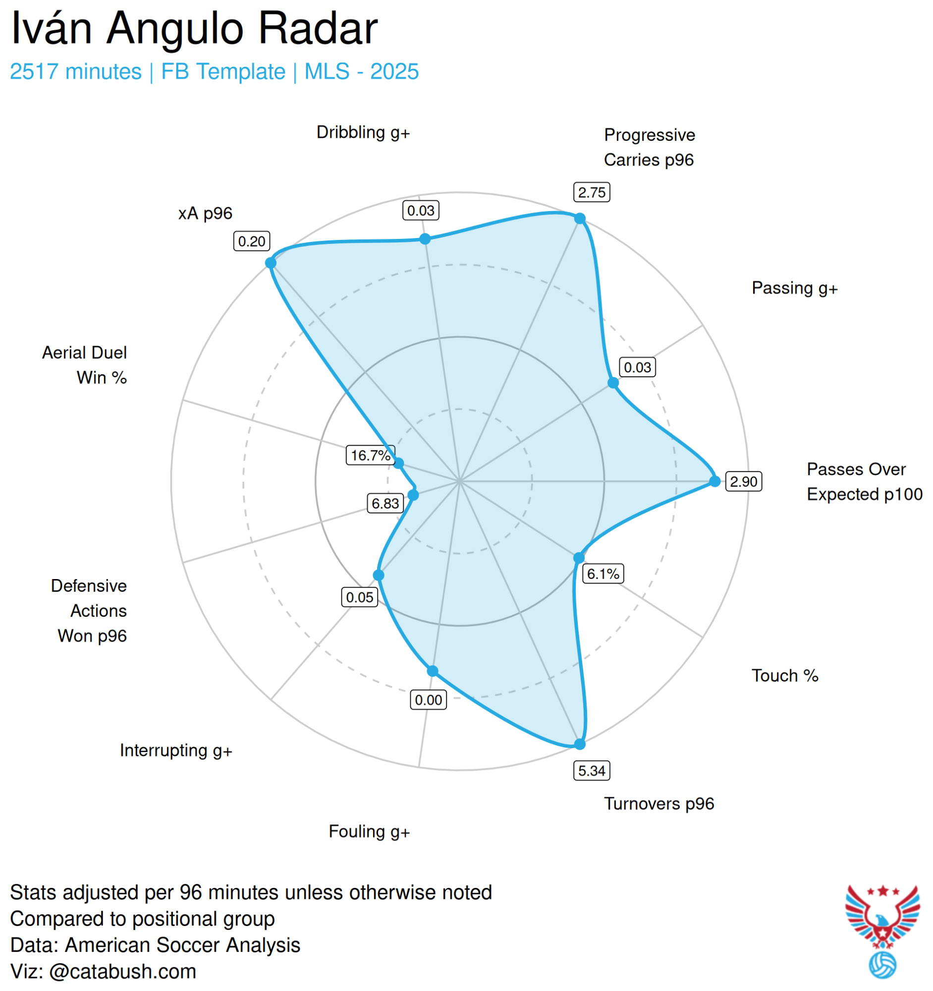 Considering Angulo’s two best tools, creating for others in the final third and carrying the ball upfield in a hurry (he had the 10th highest top speed for an MLS player) there is a potential fit here in a weird niche-Brian Schmetzer sort of way.