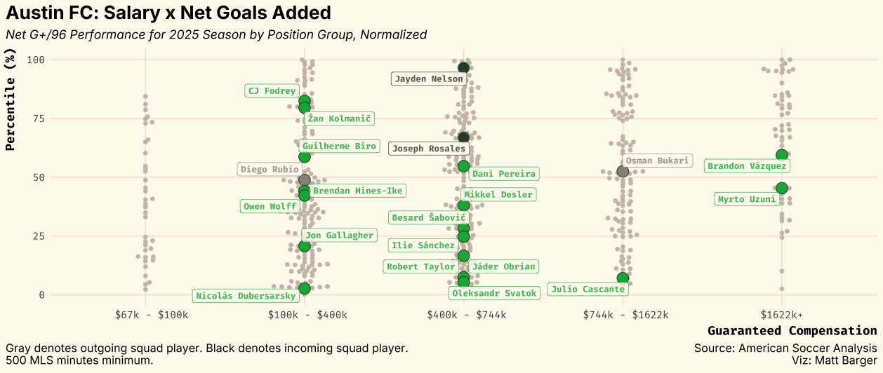 And even with designated player spends, much of sporting director Rodolfo Borrell’s strategy has been to find value with lower salaries; both players on the second-most-expensive line in 2025, Osman Bukari and Julio Cascante, have left, and Nelson in particular represents great value.