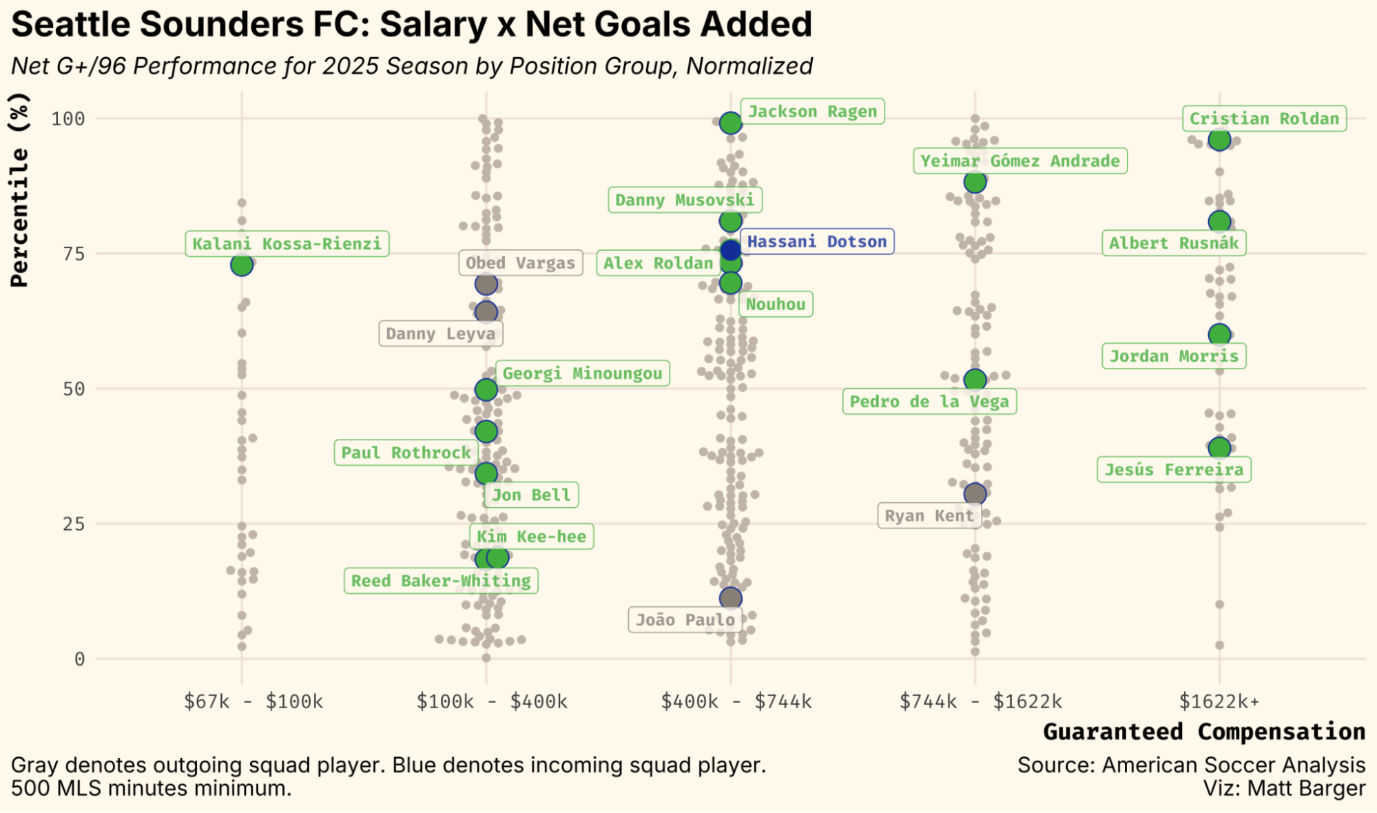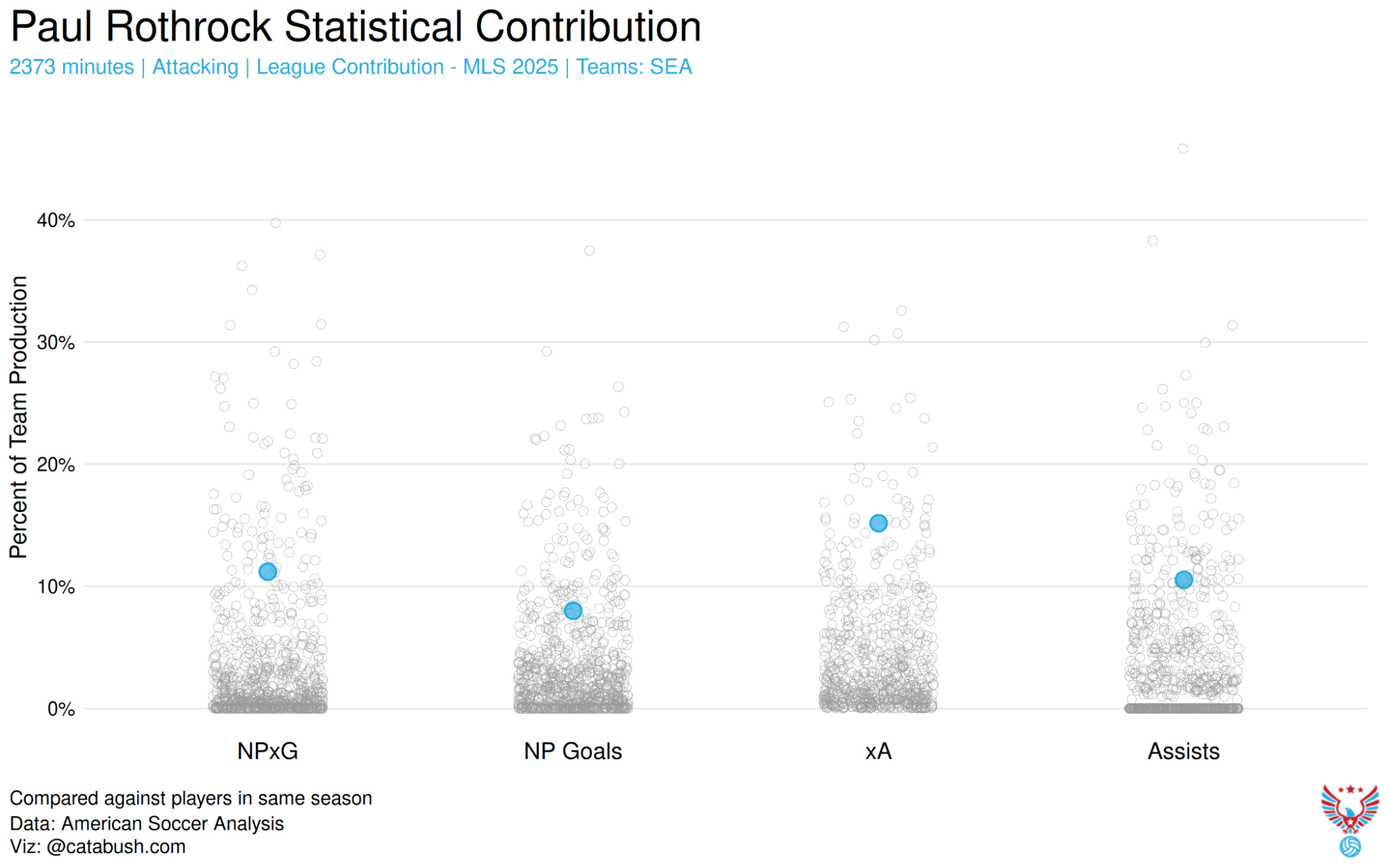 Now, back to soccer, since this is American Soccer Analysis, after all. Defensive excellence is nothing new for Seattle sports fans. For years, the Seattle Sounders played a brand of soccer that was decidedly focused on preventing goals, first and foremost. In 2025, that changed. As the Seahawks became more defensive under the fresh-faced former-DC-turned-HC Mike Macdonald, the Sounders became more offensive under the tenured Brian Schmetzer. Rather than stick to what had been (somewhat) working, Schmetzer pivoted, leaning heavily into a more free-flowing, higher-risk style of soccer that ultimately led to the Sounders’ first trophy in years. If the Seahawks were The Dark Side in 2025, the Sounders were The Rebel Alliance.