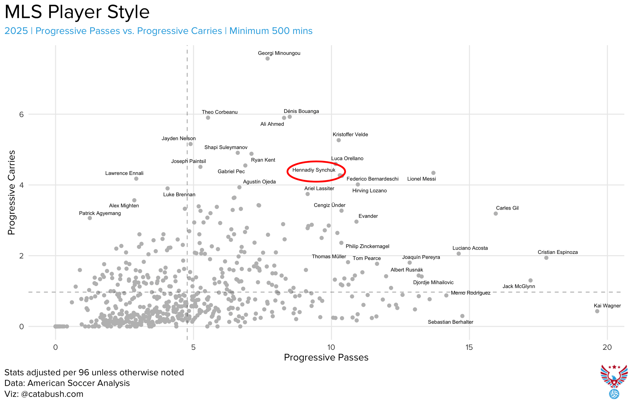Finally, U22 signing Hennadiy Synchuk had a promising 2025 as a ball progressor. He doesn’t do much else at this stage, but as a young player there’s still plenty of growth to expect from his game. If he can add end product, some better off ball movement, and a little more comfort in possession, he could be one of the better young players in the league. Of course if that happens he’s just as likely to get shipped off to Europe on a cut rate deal.