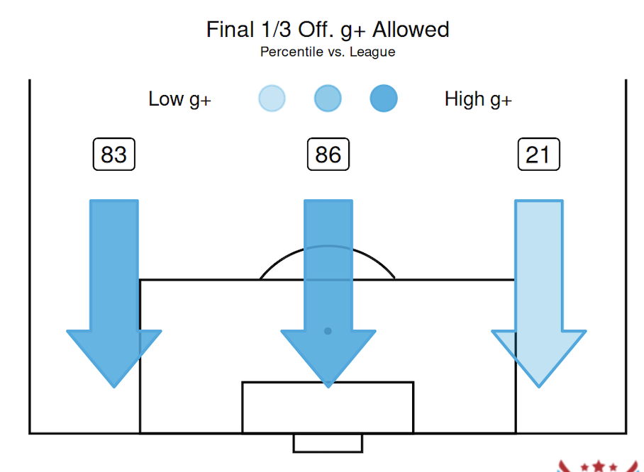 Defensively, the team was extremely shaky with their worst defensive efficiency (xG allowed per final third pass) since their opening season and their lowest all time PPDA. Though they managed to maintain possession and control most games, whenever that control broke down they could easily get carved open and let easy chances by. They couldn’t manage an effective press, but dropping into a defensive shape was fraught with danger as well.