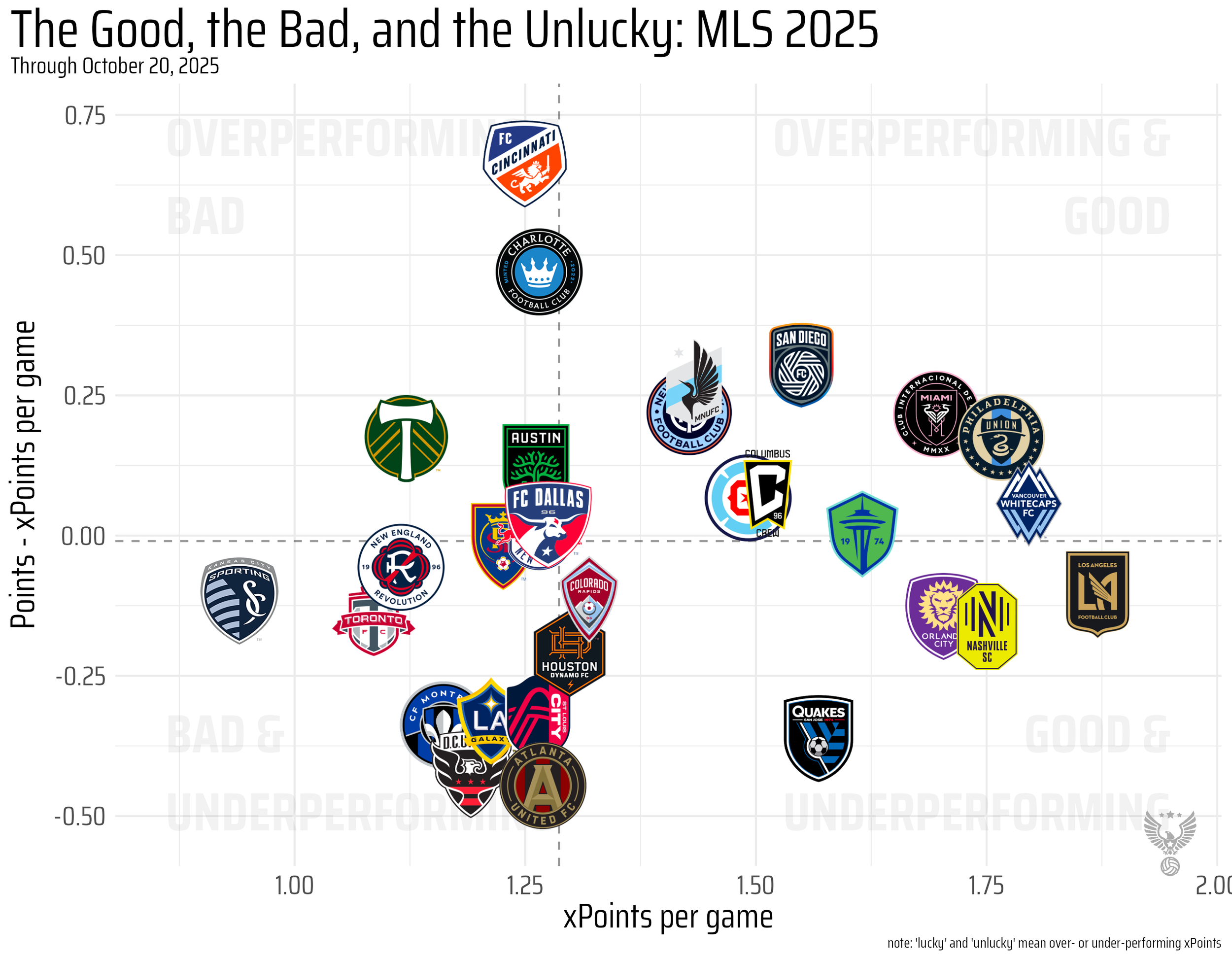 Montreal’s problems date back well before 2025. In fact, manager Laurent Courtois was hired to right the ship back in 2024, with Montreal hoping that Wilfried Nancy’s assistant could replicate Nancy’s success. Courtois managed to overperform xPoints in 2024 by almost five, and had Montreal near a playoff spot. That was enough to keep his job.