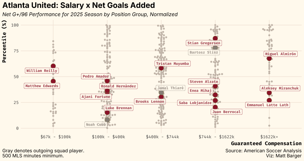 Slisz’s departure leaves Atlanta United with Ajani Fortune (-0.03 Net G+ p96 in 2025), Tristan Muyumba (-0.01), and Steven Alzate (-0.04). Spot minutes were also provided by homegrowns Will Reilly and Cooper Sanchez, but neither looks fully ready for a starting role.
