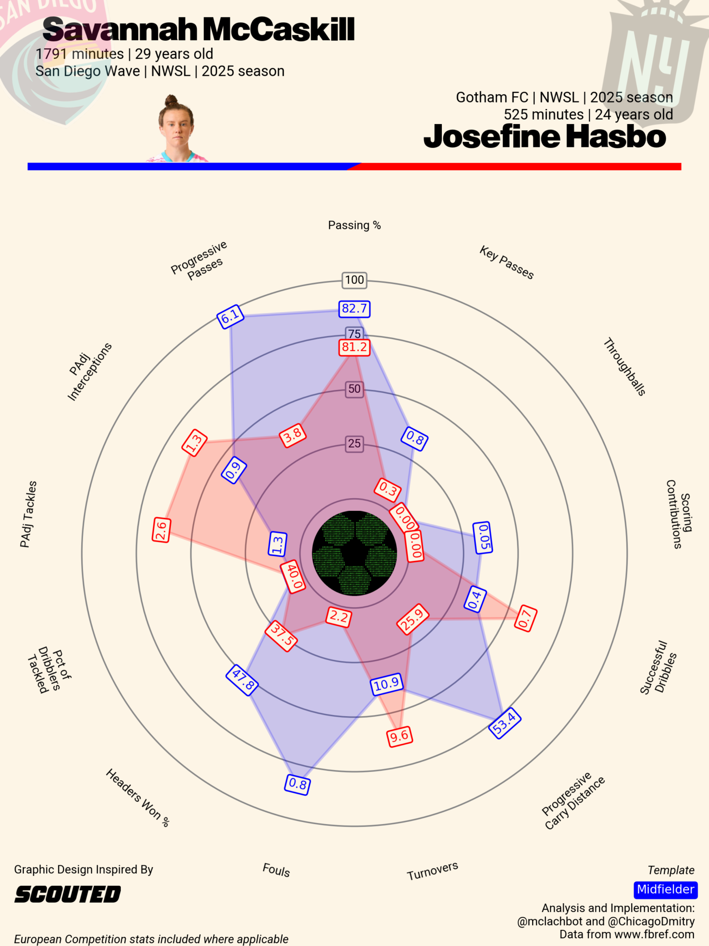 On the one hand, Savannah McCaskill was a better passer in 2025, and she has experience playing both deeper as a defensive midfielder and in more advanced roles. Gotham seemingly have no backup six, pending Taryn Torres return from injury, and Gotham has run two advanced midfielders for some time now. Welcome aboard! McCaskill has also already found her way onto the scoresheet for Gotham, earning a goal at the FIFA Women’s Champions Cup in January.