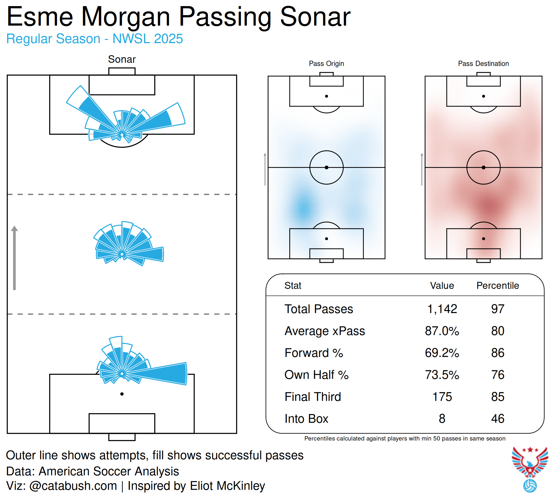 The England defender’s 1.13 G+ was fourth among center backs, and her 0.59 Passing G+ in 2025 was 14th league-wide. Ghe only center backs to place higher were Sam Staab and Kaleigh Kurtz, two standard-bearers in the category. Take a look at Morgan’s passing sonar in the attacking third: