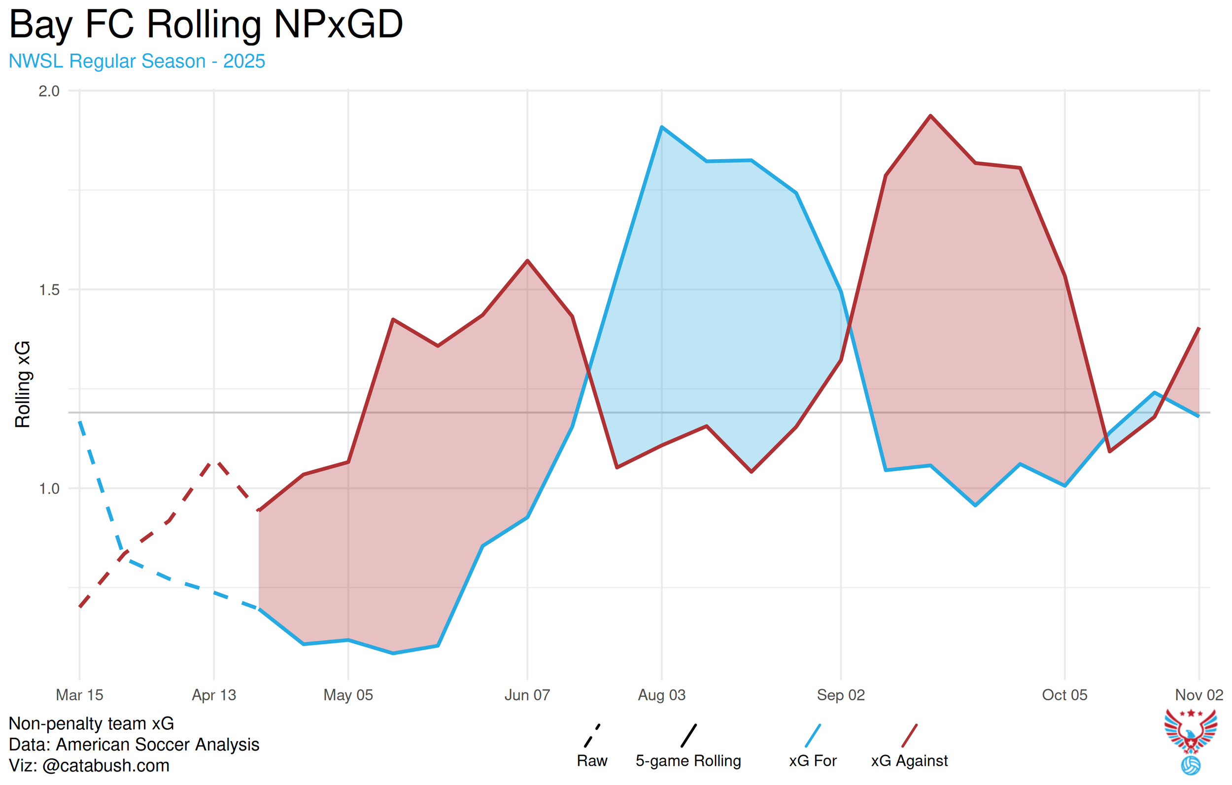 Two seasons ago, the Chicago Stars ran hot early in the season, banking enough points to eke into the playoffs, earning the right to be Barbra Banda’d in the first round. The 2025 season was a different story. The team finished with identical underlying numbers in both seasons, -14.6 expected goal difference (xGD) in 2024 and a -14.6 xGD in 2025. However, without that early hot streak and other luck along the way, the team finished with just 20 points. The Stars’ created 30.27 xG (11th in the league), while conceding 44.91 xGA, the most in NWSL in 2025.