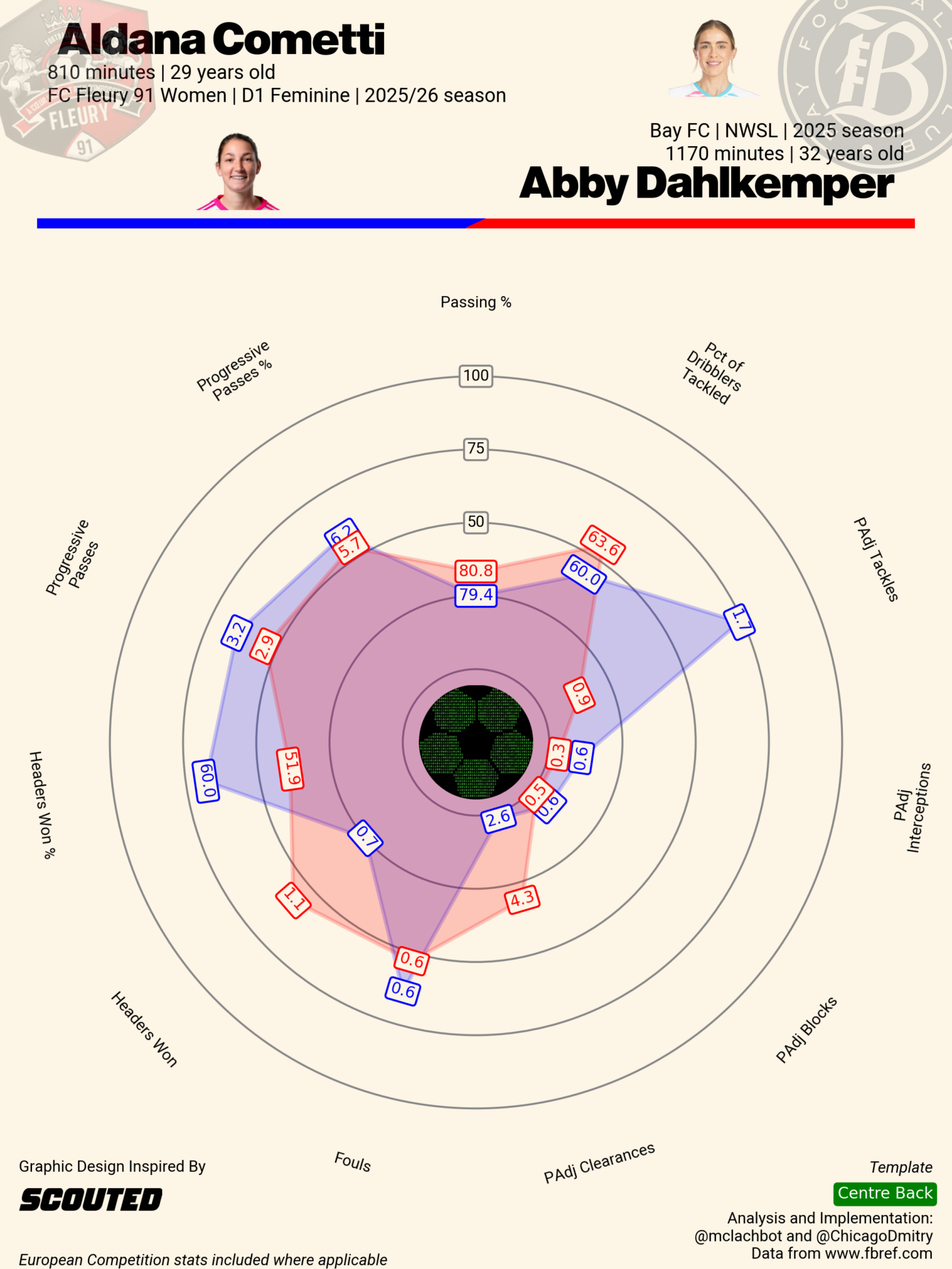 To account for the missing players, there is 2025 addition Kelli Hubly (CB), college signee Heather Gilchrist (CB), Aldana Cometti (CB), and Anouk Denton (FB). In her 750 minutes in 2025, Hubly was actually the highest-rated Bay CB according to g+, mostly by farming interrupting g+. That’s usually not a recipe for success. Gilchrist is coming off a senior year at Florida State where she anchored the College Cup winning backline, though advanced stats from Paul Harvey’s big board aren’t a fan. The hope is that the Bay analytics and scouting departments see something that these metrics miss. Lastly is Denton, who struggled to get minutes with a lowly West Ham team, but was one of Coates’ U23 players, as well as featuring for new Bay assistant Gemma Davies’ English U19’s. This week Bay announced the addition of Argentine CB Aldana Cometti, who has been plying her trade with FC Fleury 91 in the French Premiere Division. Her underlying stats should make her a decent near term replacement for Dahlkemper’s ball progression, but CB stat evaluation is hard.