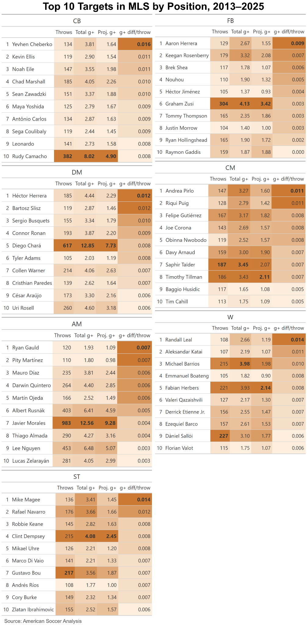 First, I excluded strikers from these tables because only one (1) of them has made more than 100 throws since the start of 2013. Perhaps I also should have excluded defensive and center midfielders! I chose to rank these tables by per-throw adjusted model overperformance to find players that can get the most value from each throw, and focus on what they do right. Djordje Mihailovic is the league leader in g+ per throw, while noted hurler Michael Boxall scores somewhat lower. Given the recency of Minnesota’s aerial assault, perhaps if we segmented by more recent times we’d see something.